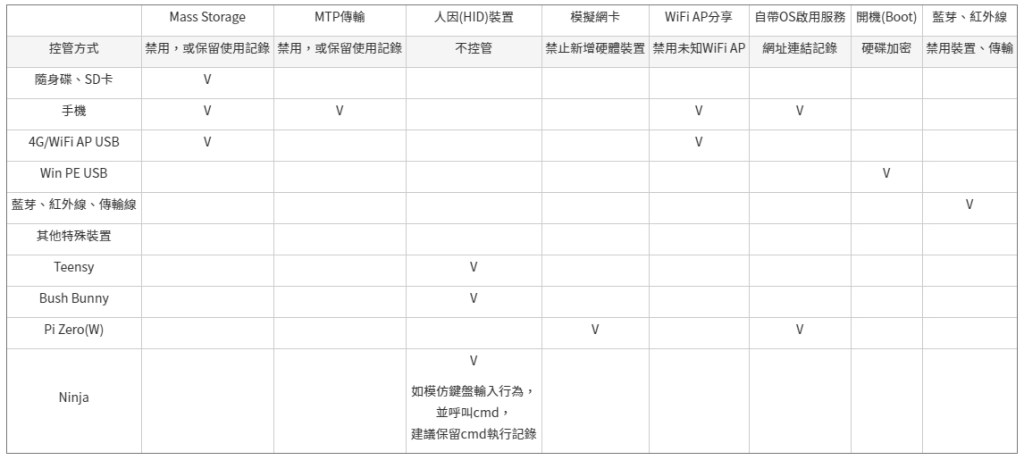 而此類型裝置,還有可能本身自帶一套小的OS系統,透過USB接上電腦,在電腦主機進入Windows OS前,完全閃躲過資安軟體,即可進入到模擬裝置的OS,進行肆虐。對於此類型裝置,可以透過硬體裝置的比對來進行標準化,若當有非標準硬體裝置接接入時,可以第一時間來禁用此裝置,降低不當裝置為所欲為。