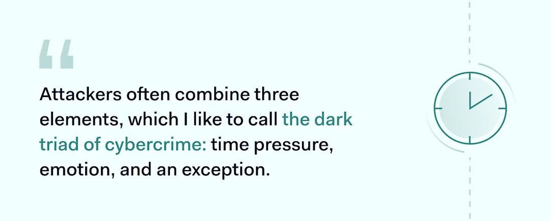 Mark T. Hofman: Attackers often combine three elements, which I call the dark triad of cybercrime: time pressure, emotion, and an exception. Be cautious if someone calls you, triggers emotions, creates time pressure, and asks you to do something unusual.