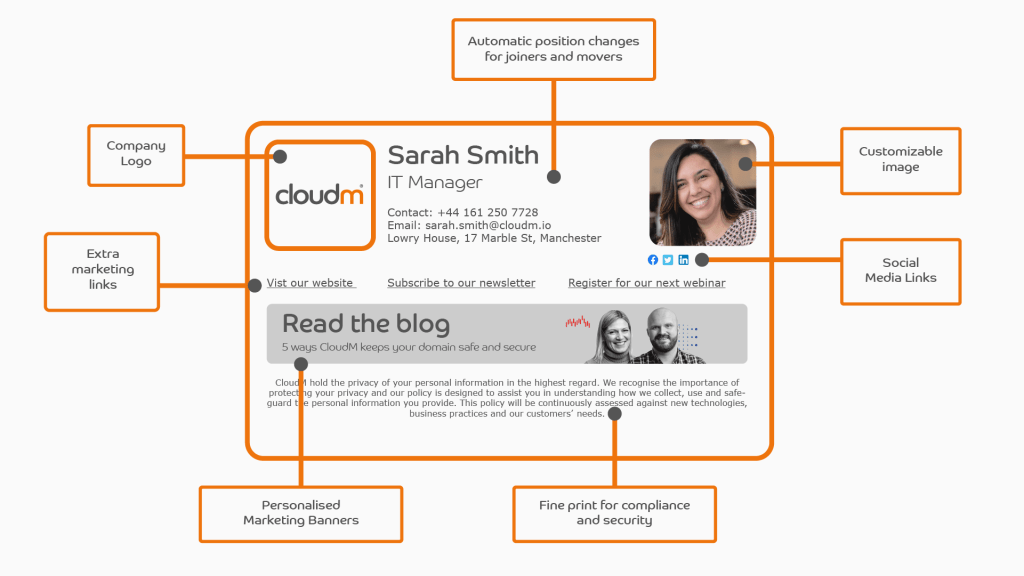We’ve all been there. A new starter without an email signature, a recently promoted employee with their old job title – it doesn’t send a good signal to customers and suppliers. And changing them isn’t always easy either, it can tie up your IT admin team and leave people waiting for support tickets to be resolved before they can get started. All of this can be automated within CloudM’s email signature management solutions. Give your people the tools they need to contribute, and rest easy knowing that your brand is unified across the board.
