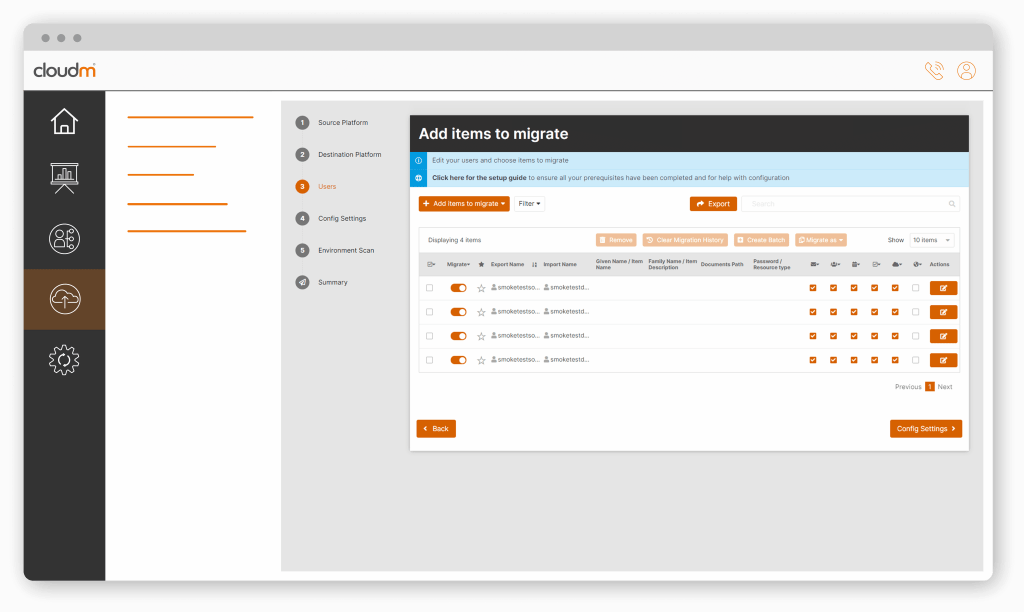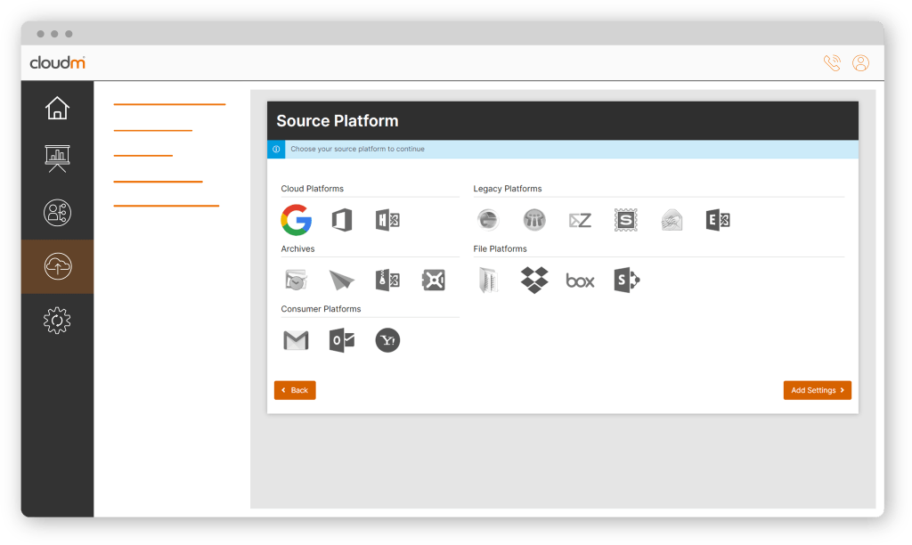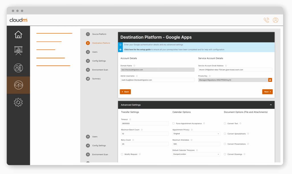 Configuring your migrations could not be simpler with our cloud migration tool, CloudM. Using a simple 5 step process, you can quickly customize the basic settings for your source and destination platforms. Additionally, we have set all the default advanced settings you will need to speed up the configuration process.