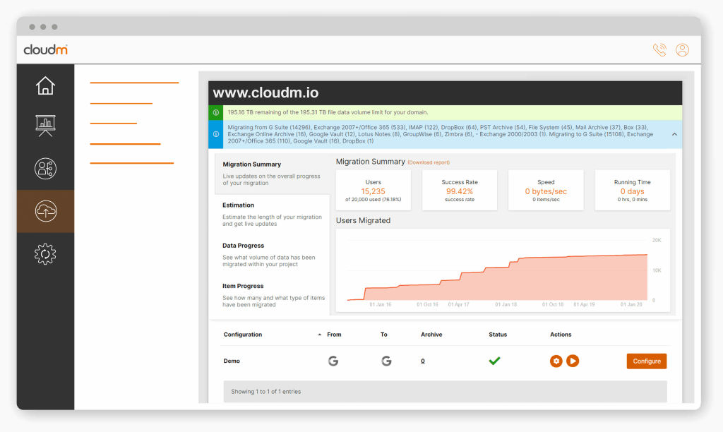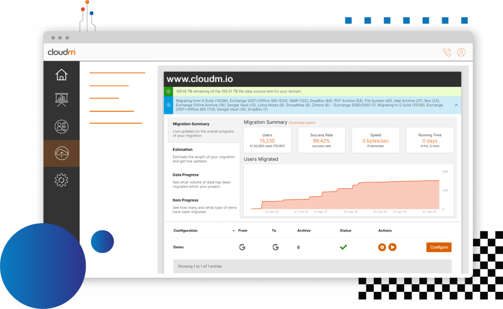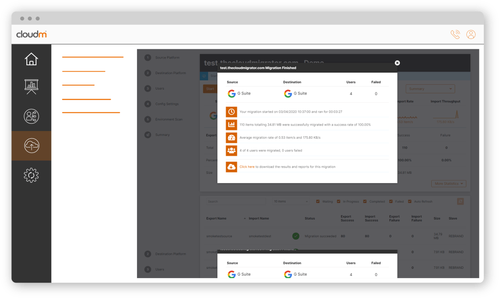 With a sleek and stylish design, CloudM’s intuitive and innovative user interface makes configuring, starting and monitoring your cloud migrations simple and speedy.