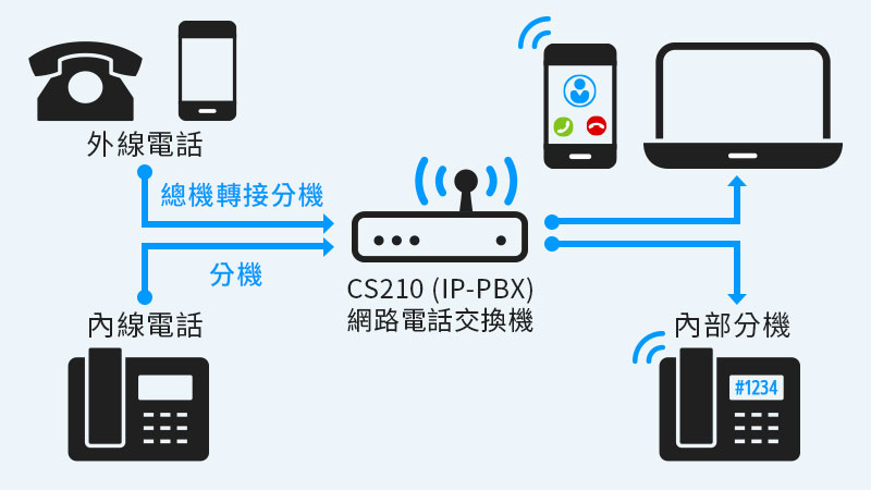 內部分機互撥:企業內部分機互撥時,桌機、手機和電腦裝置同時響鈴,並於U App上顯示來電者姓名及分機。