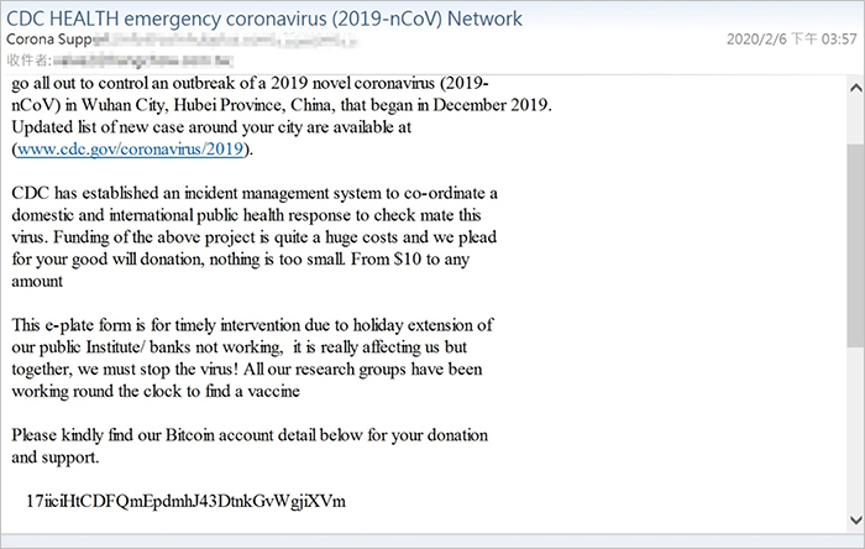 ASRC 研究中心在 2 月初就收集到假冒 CDC 疾病管制與預防中心名義進行斂財的詐騙郵件,如下圖。