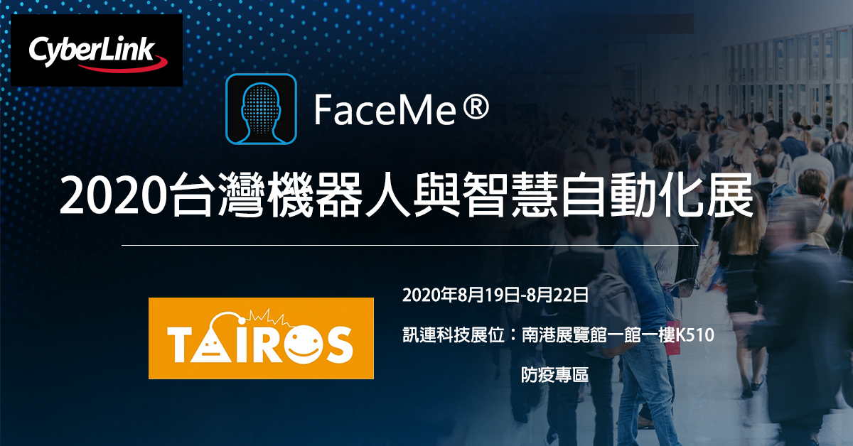 【2020年08月13日,台北訊】 全球頂尖AI臉部辨識領導廠商訊連科技 (5203.TW) 將參加2020年8月19-22日舉辦之「台灣機器人與智慧自動化展」,於「防疫專區」中,展出專為後防疫時代設計的多款解決方案,包含提供口罩偵測、臉部辨識及體溫量測的FaceMe® Health及整合智慧安控和口罩偵測的FaceMe® Security.