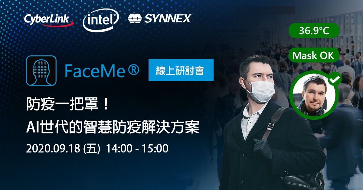 【2020年09月08日,台北訊】 全球頂尖AI臉部辨識領導廠商訊連科技 (5203.TW)宣布,與通路大廠聯強國際及物聯網領導廠商英特爾攜手合作進軍智慧辨識領域,將於2020年9月18日共同舉辦「防疫一把罩!AI世代的智慧防疫解決方案」線上研討會,於會中分享針對Intel® OpenVINO™及Movidius™等物聯網平台打造的FaceMe® Health及FaceMe® Security等多樣智慧防疫解決方案,協助各式應用場域於後疫情時代快速導入口罩偵測、身分辨識及體溫量測等應用。