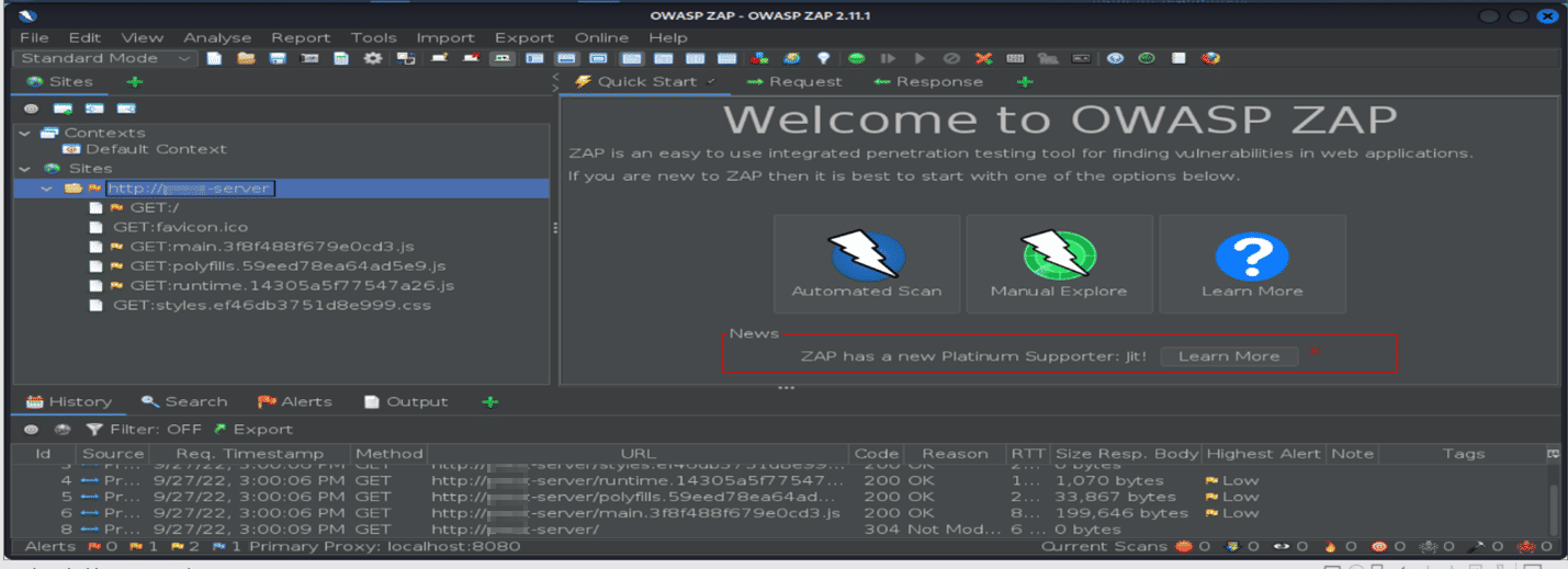 Also, within the ZAP interface, inside the tree on the left-hand side under sites, you will see that the URL of the application will appear. In my case, under sites, ZAP is showing the domain name (http://**-server); this is because I have previously set that up on Kali. The IP address resolved to that name is the one from above – 192.168.221.129 – which is my Angular app.