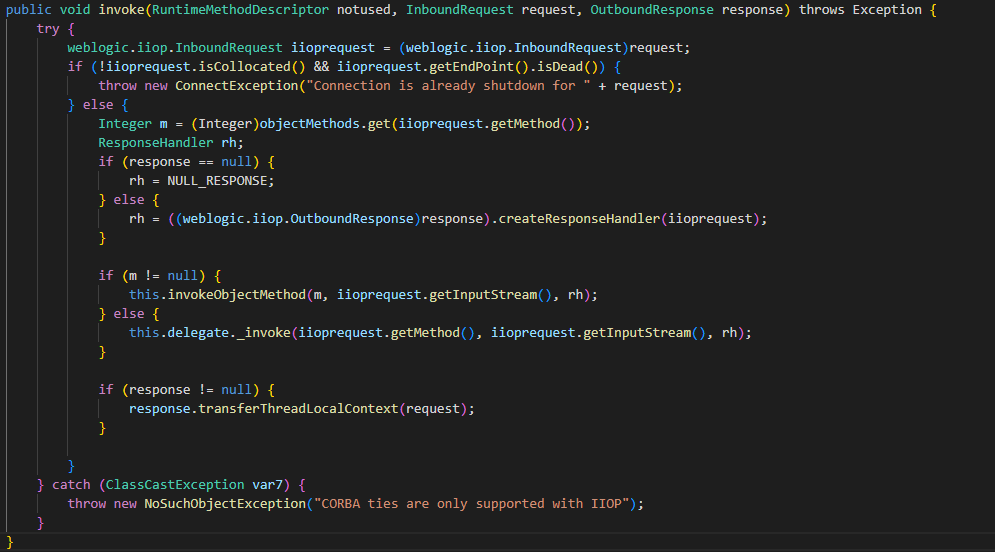 }1. It begins by attempting to cast the InboundRequest object to a specific type (`weblogic.iiop.InboundRequest`) to access additional functionality specific to this type of request.