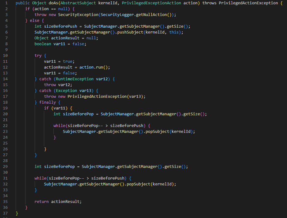 Basically, The doAs method executes a privileged action on behalf of a specific subject. It pushes the subject onto the subject stack, attempts to run the action, and handles any exceptions that occur during execution. Finally, it ensures that the subject is popped from the stack before returning the result of the privileged action.