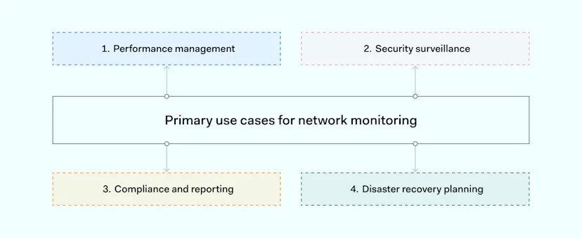 Administrators consistently observe and manage the network’s performance and can avert potential issues and enhance security. Here are the primary use cases for network monitoring.