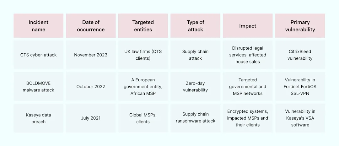1. November 2023 CTS cyberattack impacted UK law firms: in November 2023, CTS, a prominent MSP for law firms in the UK, experienced a severe cyberattack, causing service outages for many law businesses. The details of the attack, including the extent of impact and data access, remained undisclosed.