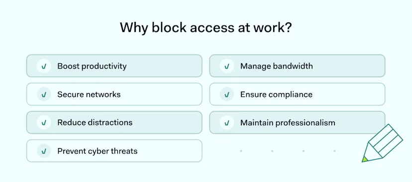 It’s important for businesses to learn how to stop employees from using non-work-related or harmful websites. This helps keep the workplace focused and safe, boosts productivity, and protects the company’s online assets.