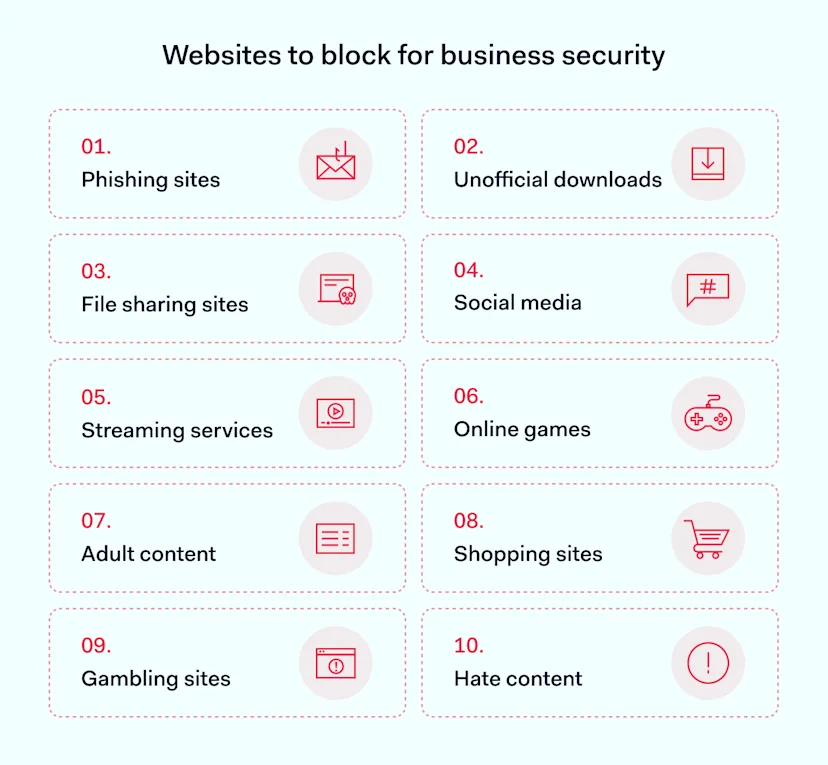 Blocking websites effectively requires a clear strategy. Here’s a comprehensive list of the types of websites your business should consider blocking access to.