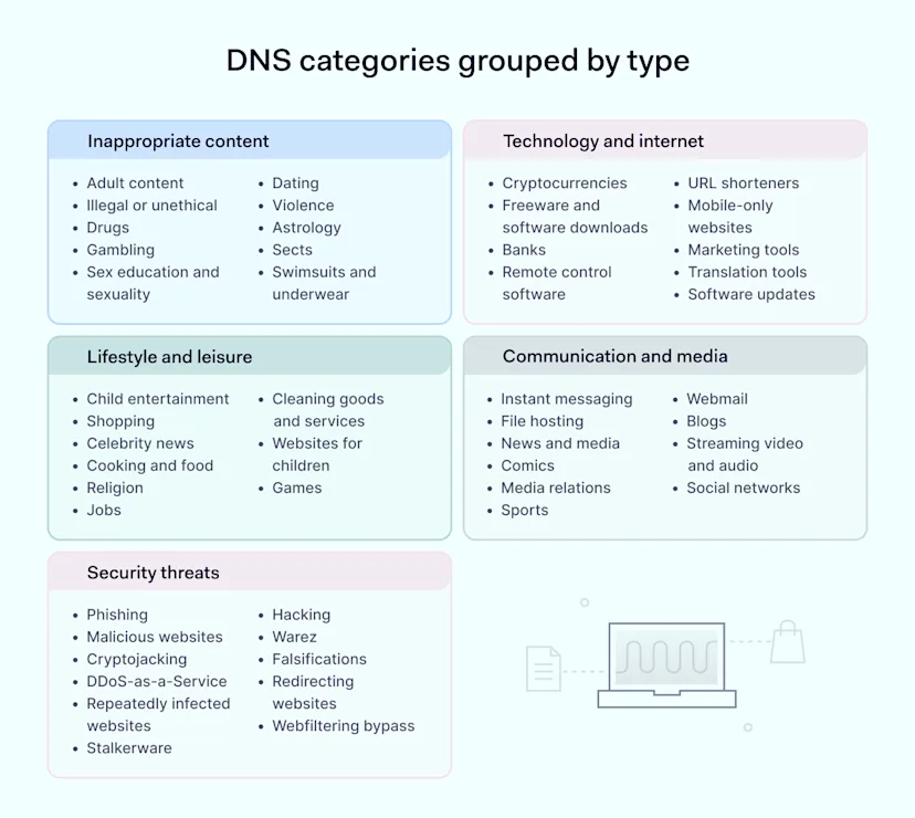 First, let’s overview DNS categories. Grouping these categories will help us better see the tendencies of what types of sites are considered to be malicious or at least avoidable. The goal here is to create clusters that share a common theme or purpose, making it easier to manage preferences or restrictions based on user needs, security protocols, or compliance requirements.