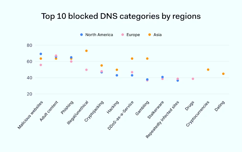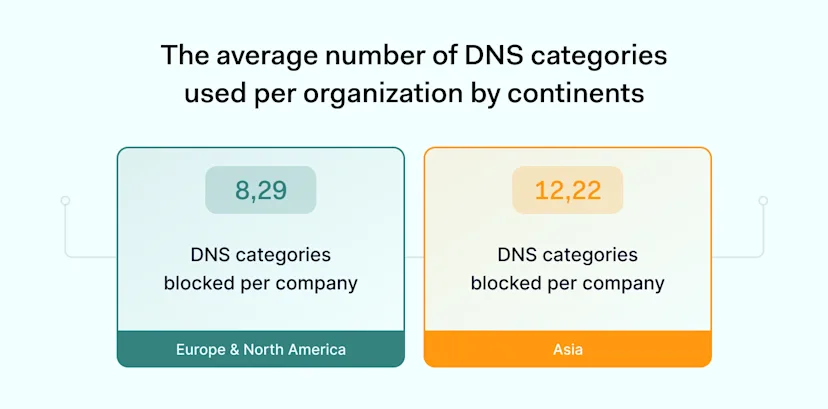 Despite various available DNS categories, companies block 10 different types of online content on average. In Asia, we see a more restrictive approach than in Europe and North America. Each region adapts its approach to DNS filtering to meet its unique challenges and objectives best.