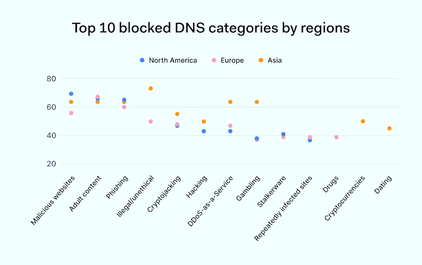 Looking at North American, European, and Asian markets, we can see that Western regions equally consider malware as their top priority for blocking, while Eastern regions prioritize blocking illegal or unethical content. Adult content like pornography sites and explicit content is the overall second pick, with Europe leading the group.