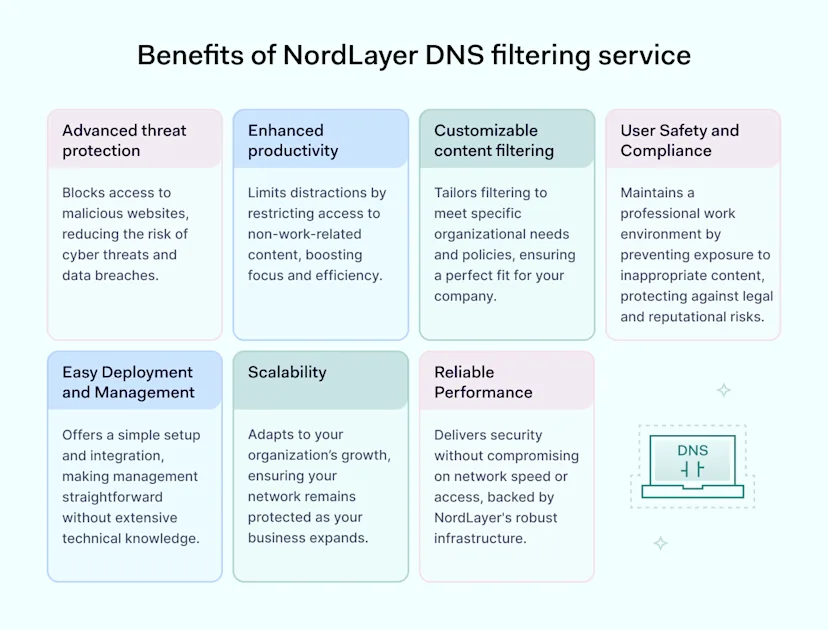 Choosing NordLayer’s DNS filtering service offers organizations a suite of powerful benefits designed to enhance their network security, improve productivity, and ensure a safer online environment for all users.