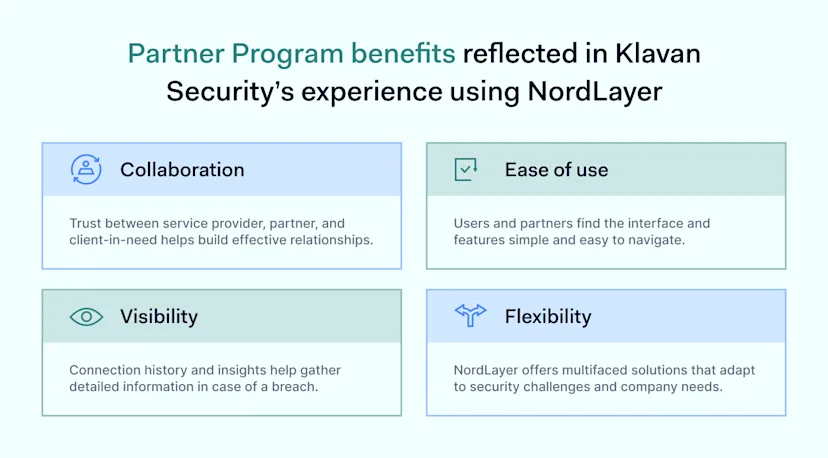 Benefits of NordLayer Partner Program. The partnership enhances Klavan’s security offerings, streamlines client onboarding, and supports complex compliance needs with NordLayer’s easy administration and insightful dashboard.