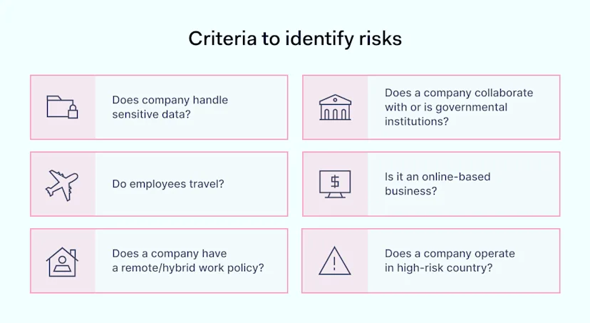 When assessing the risks, the Klavan Security Services approach follows a deduction model. First, they define the approach of needed support. Then, by identifying the type of company, how it functions, and what it does, the company can follow up on the common risks and vulnerabilities in that regard.