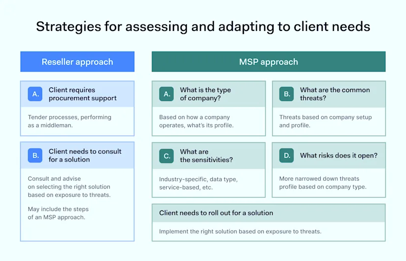 Various industries, work models, and processed data indicate diverse security strategies and targets when protecting a business. Not only client security needs but a type of needed support urges for flexibility and trust-based partnership to adapt to particular client scenarios: