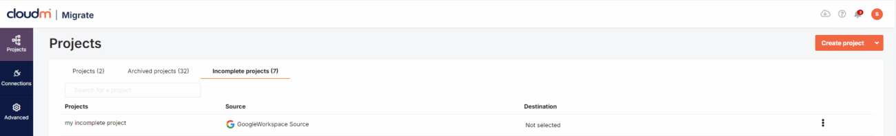 Image: Migrate 4 enables you to create your projects in stages, allowing you to pick them back up via the incomplete projects tab.