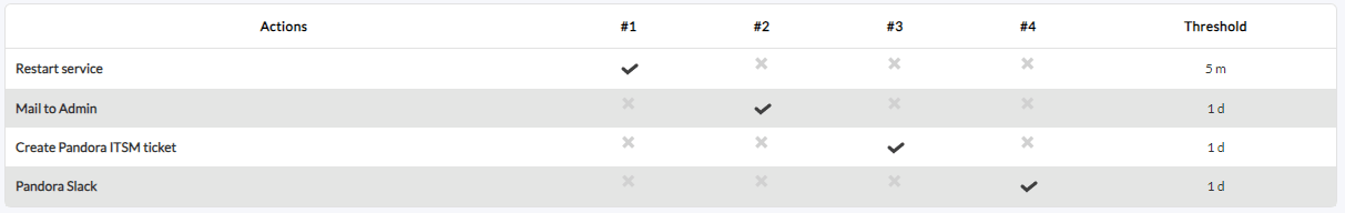 This alert (executed daily) has three actions: at first, it is about restarting the service. If at the next alert execution, the module has not been recovered, an email is sent to the administrator, and if it has not yet been solved, a ticket is created in Pandora ITSM. If the alert remains triggered on the fourth run, a daily message will be sent through Slack to the group of operators.