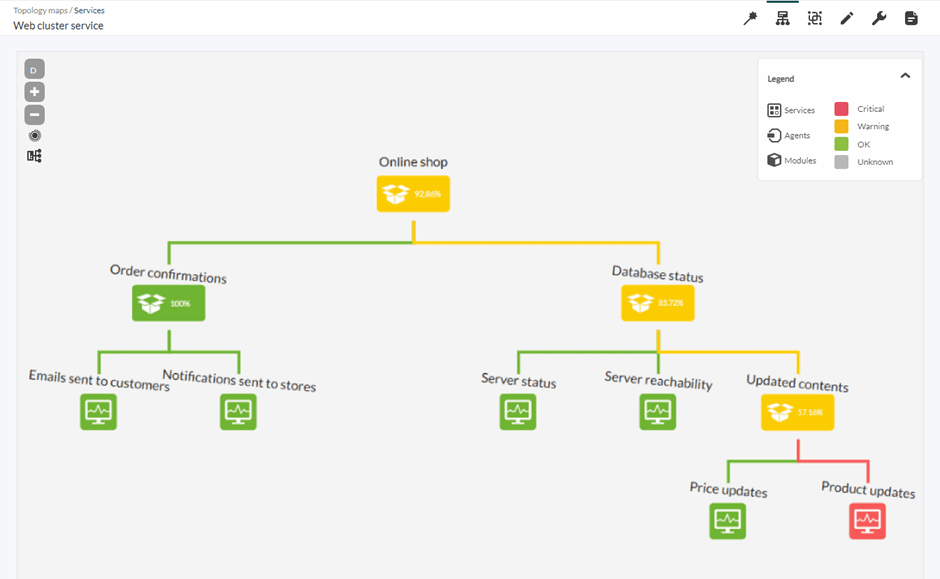 - Using services can help you not only reduce the number of alerts triggered, but also the number of alerts configured. If you have a cluster of 10 machines, it may not be very efficient to have an alert for each of them. Pandora FMS allows you to group agents and modules into Services, along with hierarchical structures in which you may decide the weight of each element and alert based on the general status.