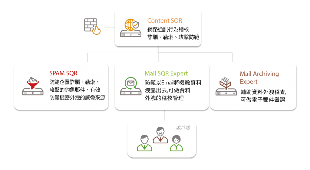 Content SQR 是全方位的網路內容安全解決方案,具有Email、Webmail、Web、IM、P2P、FTP、Telnet及遠端桌面管理…等應用層服務(Layer 7)的內容管理與流量分析,過濾分析技術能涵蓋網路層到應用層,以提供網路內容安全的縱深防禦服務。