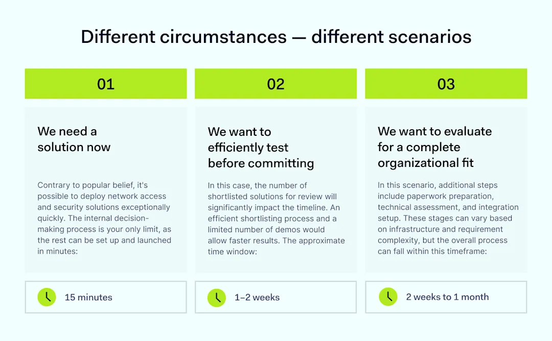 NordLayer offers a Decision Maker’s Kit, a free resource designed to help you build a strategy for selecting the most suitable solution for your organization. This kit provides step-by-step guidance from start to finish, ensuring you make an informed decision.