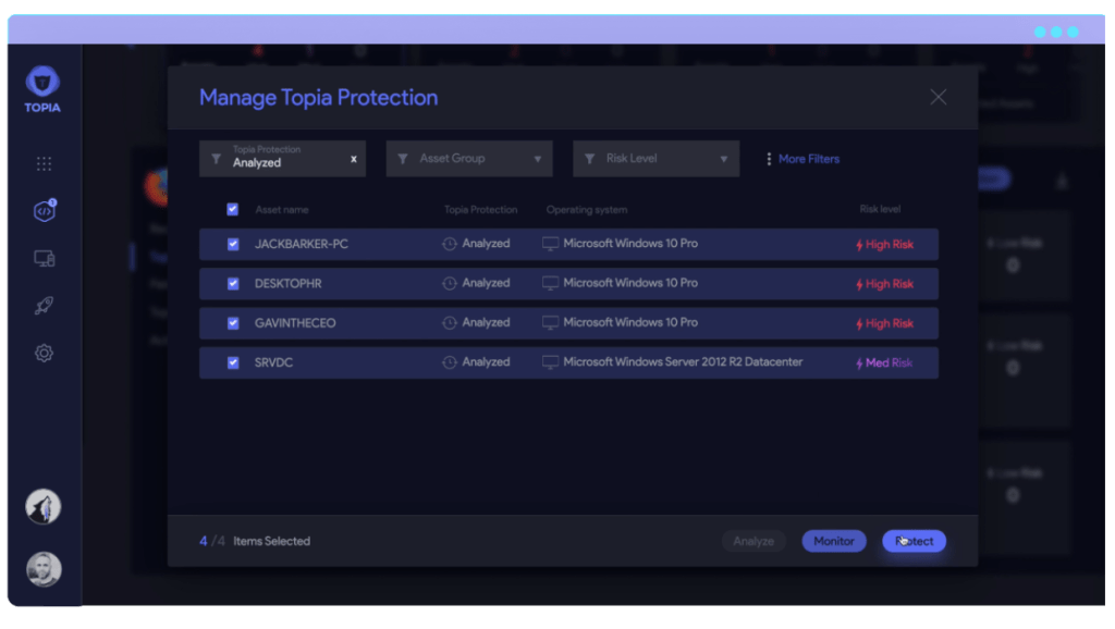 Topia’s patch management features are rich, simple, and efficient. Rather than creating a package and script for each patch, security teams can knock out their Patch Tuesday workload in just a few clicks. And because threat analysis is connected to patch management, you can see the risk update immediately.