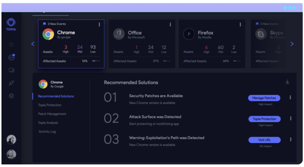 TOPIA analyzes, prioritizes and protects third-party apps against threats and attacks. Manage your organization’s security patch cycle from start to finish and protect more, faster by focusing on the threats that matter most—with or without security patch.