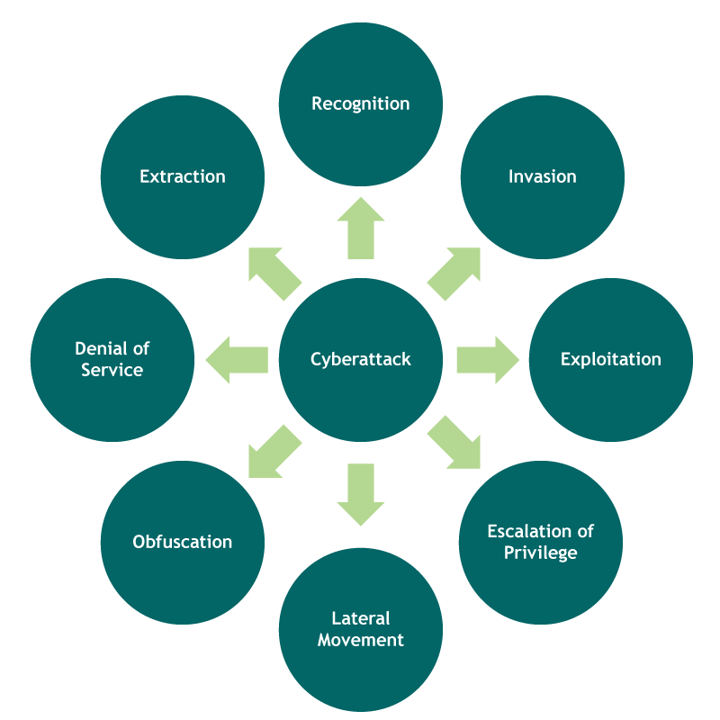 - Denial of Service: disruption of the normal access by users and systems to prevent the actions of the attack from being monitored or blocked.
