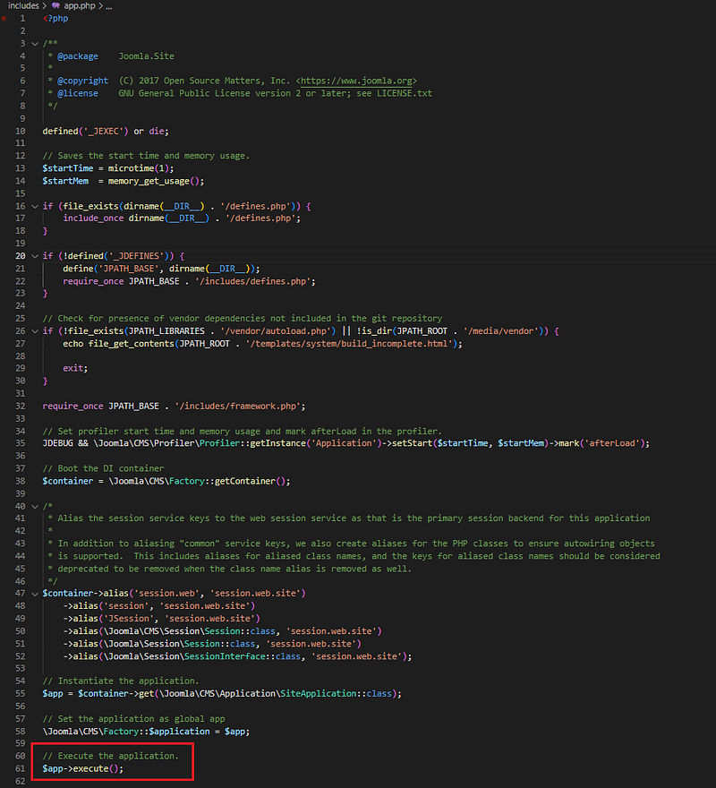 As debugging and reverse engineering a binary program, usually you would set a breakpoint on the main function. we will do the same here, and in our case index.php can be considered as the main, and it starts running when it runs the app.php which all executable code should be triggered through it.