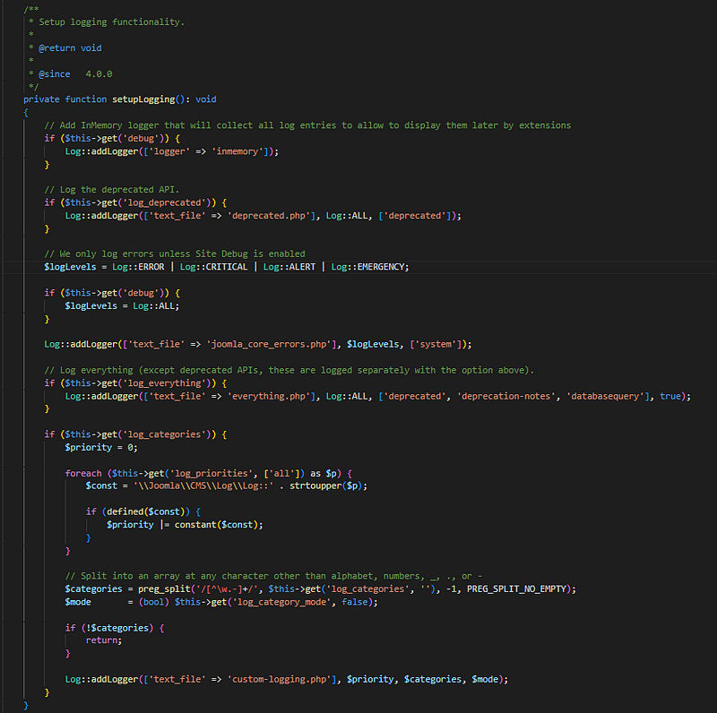 This method sets up the logging configuration for the Joomla CMS application. It checks the application configuration for various logging-related settings and configures loggers accordingly.