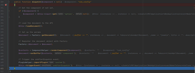 going back to dispatch() basically, it’s responsible for rendering a particular component (specified by $component or via the ‘option’ HTTP GET parameter) and setting up the associated document buffer, while also triggering a plugin event after the component has been dispatched.