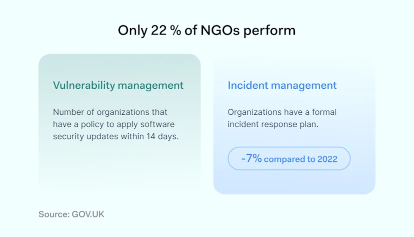 The lack of dedicated IT staff and insufficient cybersecurity training further heightens these risks. Only a third of NGOs have people with some level of cybersecurity knowledge.