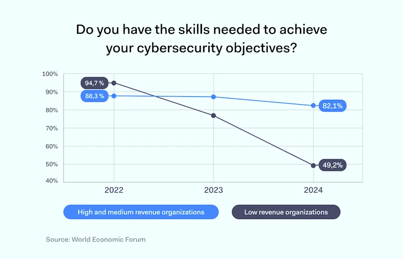 The World Economic Forum insights report reveals the actual decline in professionals with cybersecurity competency in lower-revenue organizations. It confirms that the perception of the actual threat landscape potential is shrinking compared to higher-income NGOs because of the lack of gathered and evaluated data.