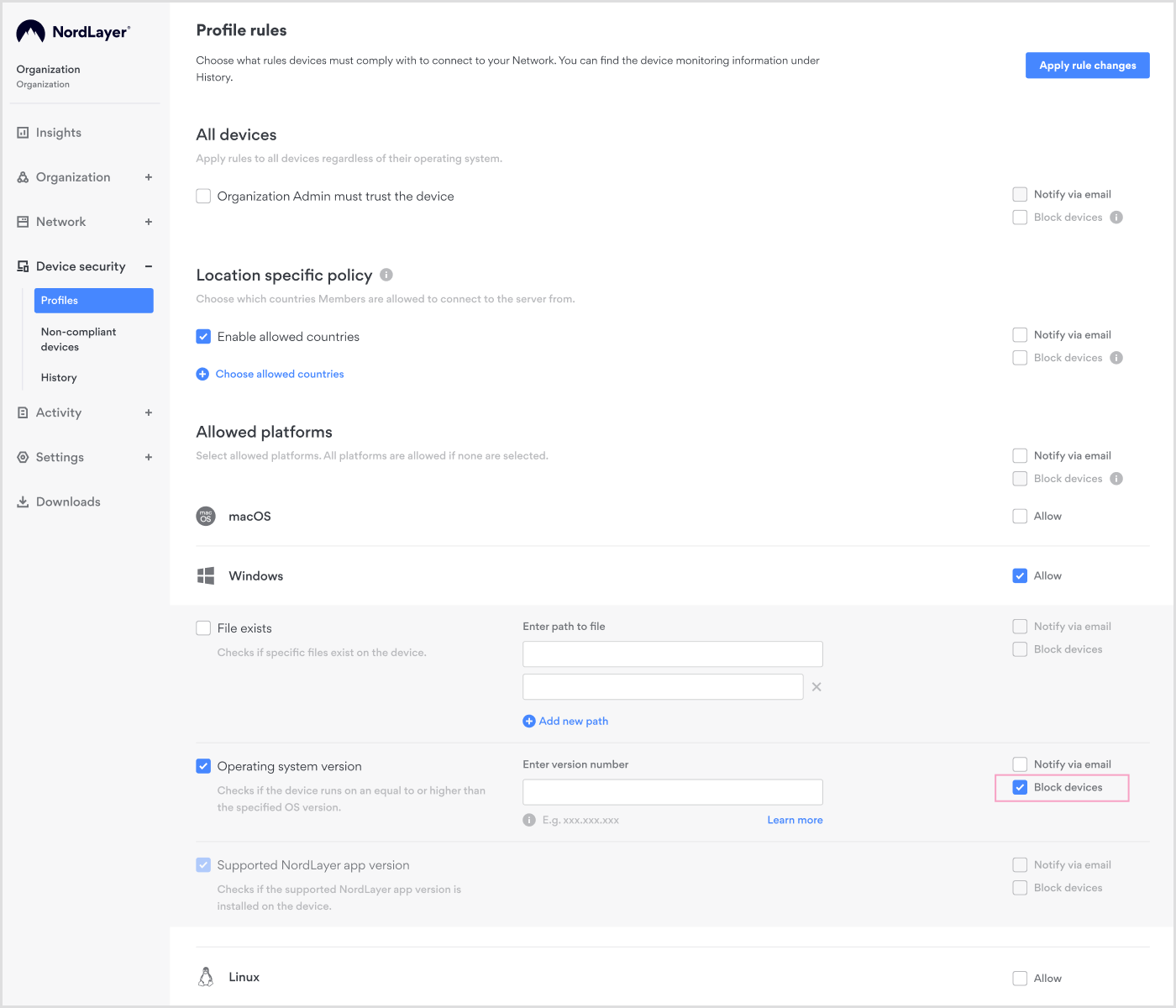 IT administrators can easily implement ACLs for Device Posture Security using our web-based Control Panel. To enable DPS checks, create various rules such as existing file check, OS version, jailbreaking or rooting status, and device location. Setting up ACLs in the panel is simple. Just create a profile and specify the desired rules. Once configured, it’s important to test the ACL to ensure that it is functioning as expected. Finally, activate the ACL to start enforcing the specified access control rules on your network.
