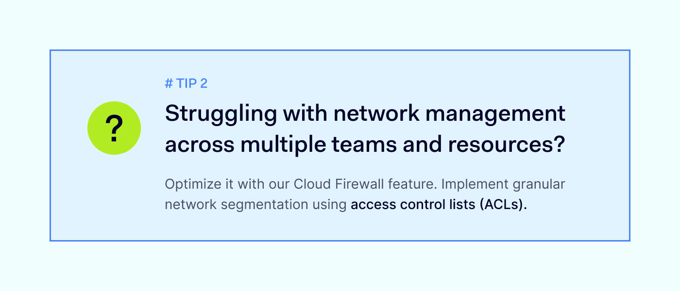 Additionally, when you combine ACLs with role-based access control (RBAC), you gain even more control over who can access different parts of your network. With our Cloud Firewall feature, you can optimize your network by implementing granular segmentation using ACLs. These lists act as virtual bouncers, controlling who can access which parts of your network.