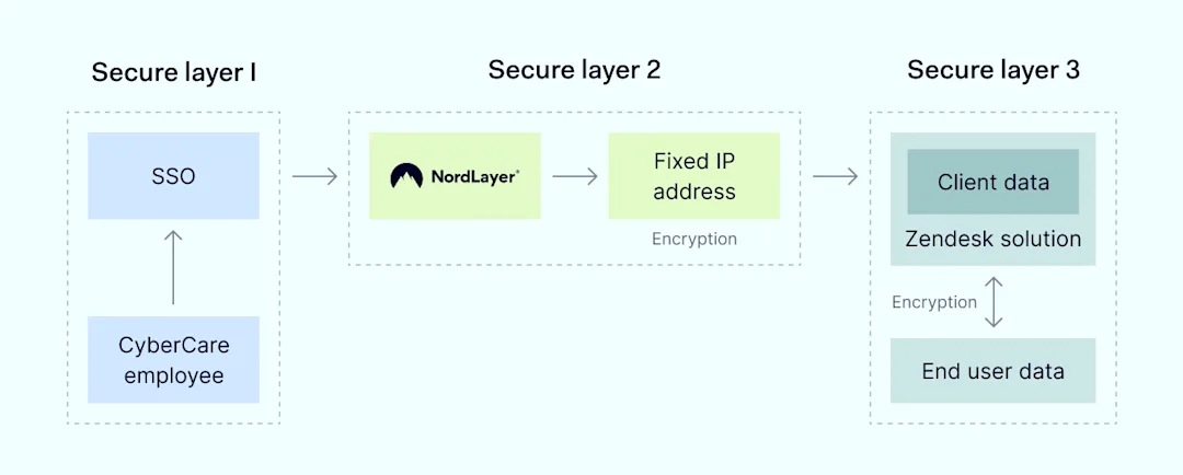 CyberCare leverages NordLayer to ensure that the login process to Zendesk is encrypted and secure. With NordLayer, they assign fixed IPs, meaning Zendesk can be accessed securely via these IPs. This setup guarantees that both the traffic within Zendesk and the access to it are encrypted and safeguarded.
