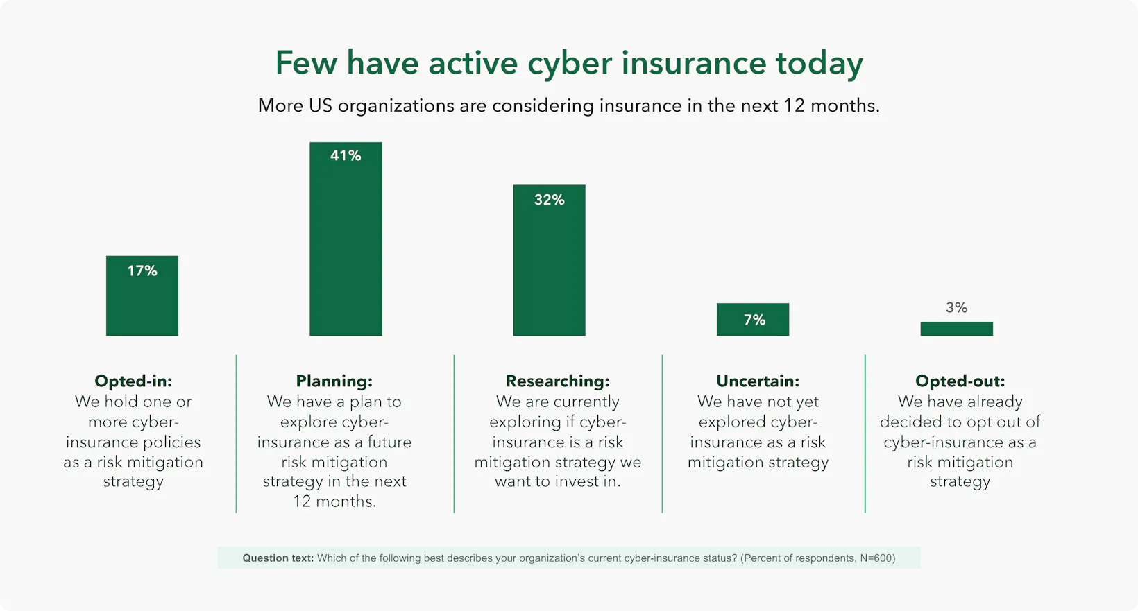 Of US organizations polled, 58% reported either opting in to one or more cyber-insurance policies or planning to do so in the next 12 months to mitigate their ransomware risk.