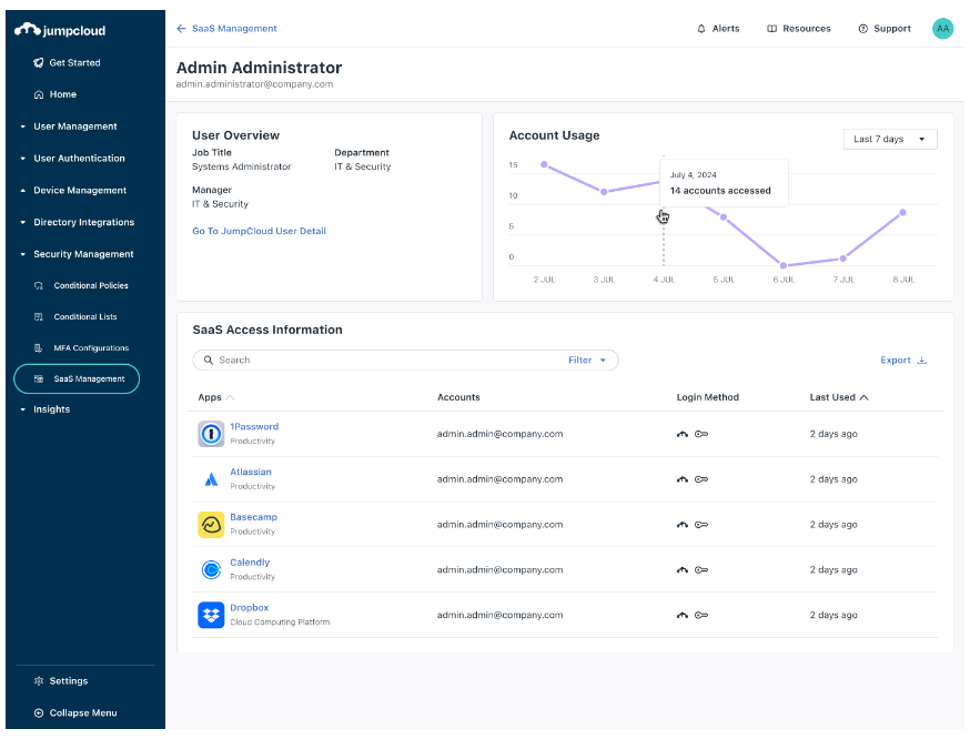 儘管一些 MSP 使用防火牆或路由器報告等解決方案來應對這些風險,但隨著混合辦公和遙距工作的普及,這些方法變得不再那麼有效。JumpCloud 提供的幾乎實時的 SaaS 使用信息,能幫助 IT 管理員更好地掌控 SaaS 使用情況,並與客戶共享。