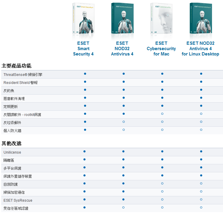 ESET NOD32 Antivirus 4 Linux 版與同類產品比較: https://www.eset.hk/home/products/