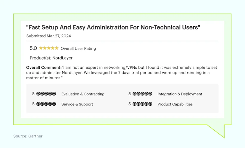 NordLayer receives positive reviews for its Zero Trust Network Access (ZTNA) solutions, Secure Web Gateway (SWG), and Security Service Edge (SSE) capabilities like Cloud Firewall (FWaaS).