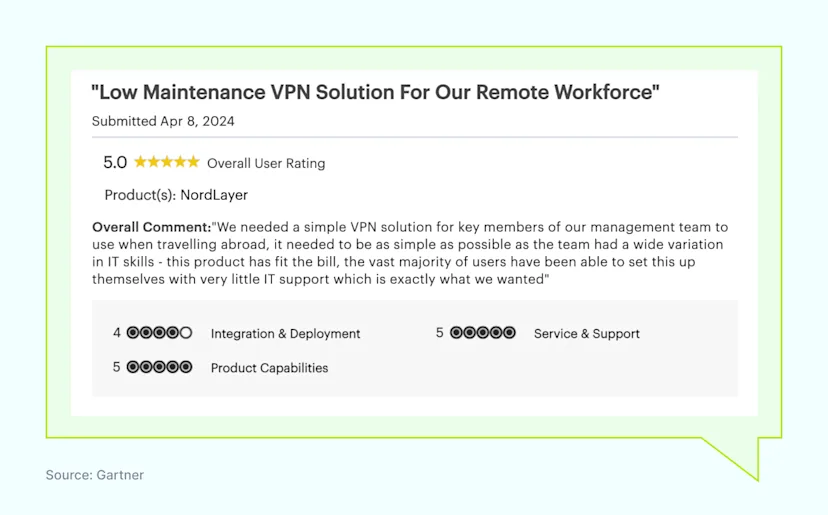 NordLayer is rated 4 out of 5 on TechRadar, 4.5 out of 5 on Gartner, which is the most authoritative source for technology reviews and insights, and 4.3 out of 5 on G2, a popular platform for user reviews and ratings of software products.