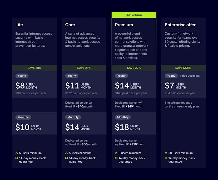 Disclaimer: This article is based on third-party reviews and open-source online information accessed between June 6 and 10, 2024. NordLayer is not responsible for data accuracy, as competitor information is subject to change. The competitor information was gathered through manual research, including feature comparisons and product analysis.