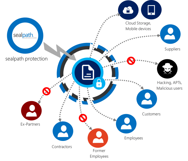 SealPath protection accompanies the document both on your network and on customers’ or partners’ networks, in the cloud (e.g. Box, Dropbox, etc.) or on a mobile device. It controls who accesses the data, when and with what permission (read only, edit, print, copy and paste, etc.). You can see the details of accesses to the document and if anybody has attempted to gain access without permission. If you cease to collaborate with the holder you can block or delete the document so that it is inaccessible to that user or anyone else.